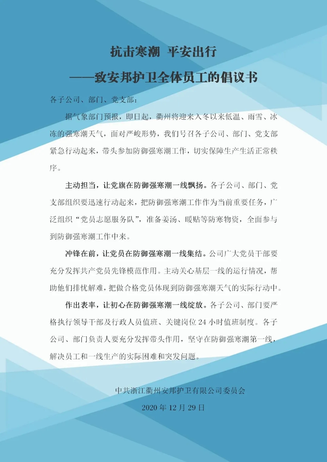 12月28日-29日,浙江衢州安邦护卫有限公司快速部署,全力做好低温雨雪冰冻天气防范应对工作。