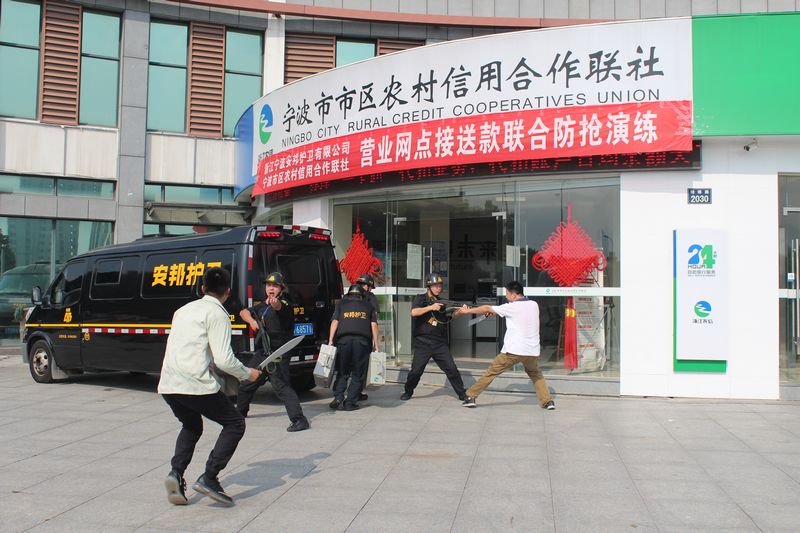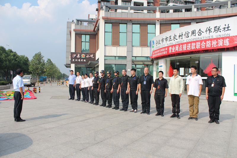 9月26日下午,在宁波市公安局治安支队支持配合下,公司与市区信用联社联合在该行应嘉丽园支行,以防止歹徒在款箱到达网点装卸时进行持械劫为主题,开展了应急预案演练,市公安局治安支队保安监管大队大队长陈炎军、市区信用联社安全保卫部总经理胡文亮、市保安协会办公室副主任吴倩倩等一行6人到场观摩。