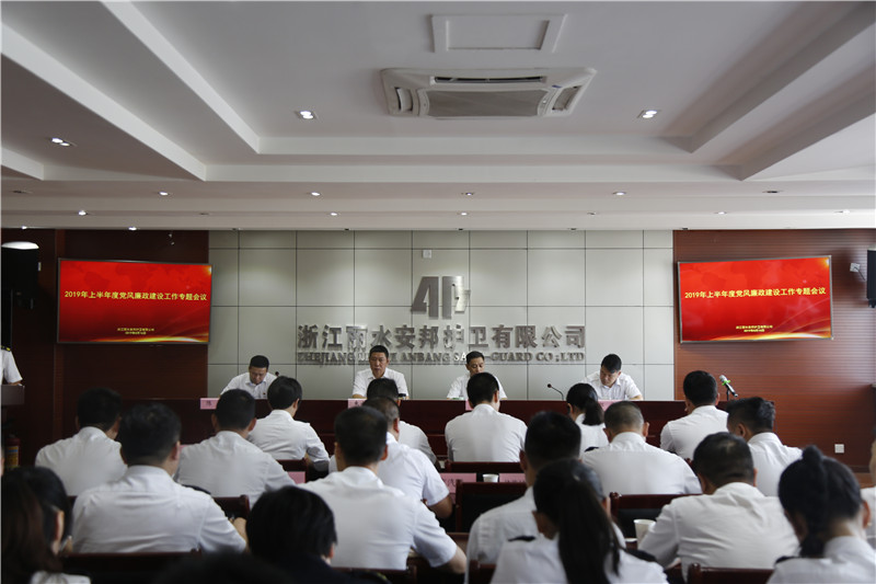 8月16日,丽水安邦护卫公司召开2019年上半年度党风廉政建设工作专题会议,公司党委班子成员,总经理助理,各部门、大队、子公司副职以上干部,部门全体员工参会,会议由党委委员陈彬主持。