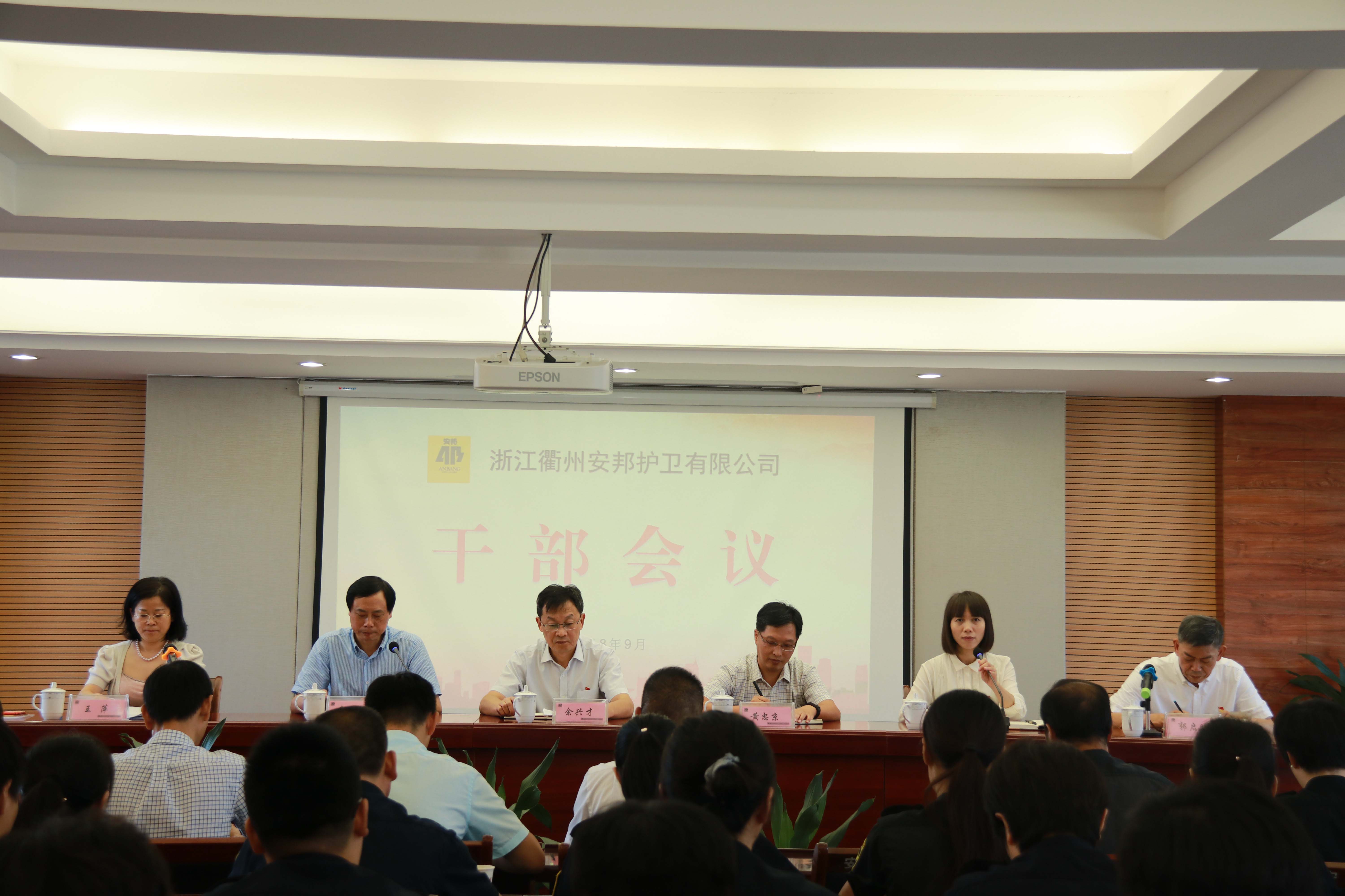 9月20日上午,浙江衢州安邦护卫有限公司召开全体干部会议。集团公司党委副书记余兴才,衢州市公安局党委副书记、常务副局长黄忠京,集团公司组织人事部部长王萍,原衢州市公安局警务保障处处长张淑芬,公司董事长童林华,党委副书记、纪委书记郭启明在主席台就坐。会议由董事长童林华主持。公司党委委员、总经理助理郑胜,各子公司、部门负责人及全体行政人员参加了会议。