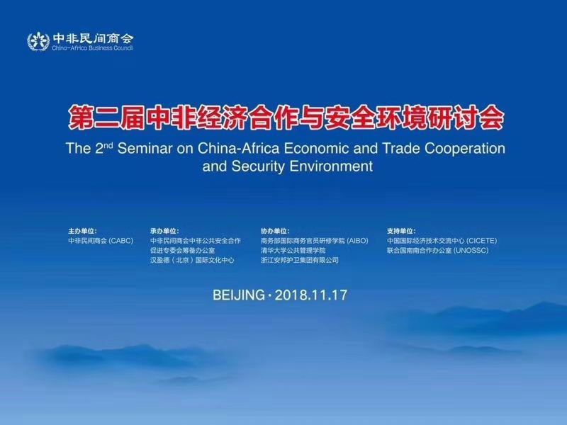 为贯彻“一带一路”倡议,落实2018年中非合作论坛北京峰会精神,更好地服务中国企业走出去。11月17日,由中非民间商会主办,中非民间商会中非公共安全合作促进专委会筹备办公室和汉盈德(北京)国际文化中心承办,商务部国际商务官员研修学院、清华大学公共管理学院和浙江麻豆做爱 有限公司共同协办的“第二届中非经济合作与安全环境研讨会”在商务部国际商务官员研修学院国际报告厅成功举办。中非民间商会副会长兼秘书长王晓勇、汉盈德(北京)国际文化中心董事长高兆民出席开幕仪式并致辞。商务部国际商务官员研修学院原院长金旭,乍得驻华大使馆经济参赞穆斯塔法,国防大学教授、军事战略专家,中国石油天然气集团公司外事局领导,生命方舟军事与安全资源管理集团董事长为本届研讨会做主旨发言。来自商务部国际商务官员研修学院、国防大学国际防务学院、清华大学公共管理学院的非洲政府官员、高级军官代表以及津巴布韦驻华武官都先后进行了精彩的发言。本届研讨会共有来自40多个国家的80余名非洲政府官员、高级军官和部分驻华使节,国内有80余名中方企业届负责人和知名专家学者参会。