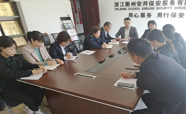 安全工作再部署 紧绷“安全弦”。10月13日上午,安邦保安公司再次召开安全工作部署会,衢州安邦护卫党委委员、副总经理郑胜,安邦保安公司总经理席霞、副总经理金国飞及各队伍管理人员参加。会议强调,公司上下要团结一致,在思想上高度重视,在行动上全力以赴,做好疫情防控、队伍管理、安全生产等各项工作。会后,各部门第一时间落实会议要求,制定队干部二十大期间值班巡查安排表,确保人员、思想时时处在战备应急状态。一线部门继续深入驻点,严抓安保日常勤务,全力排查各类安全隐患。