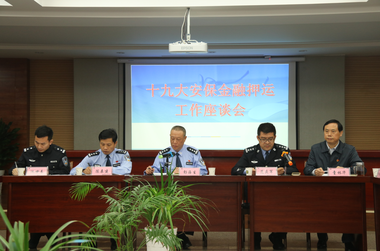 10月16日下午,十九大安保金融押运工作座谈会在衢州安邦公司二楼会议室召开。市局治安支队支队长范庆军主持了会议,市局党委委员彭海生出席会议并作重要讲话。市局治安支队副支队长池世春、警卫处政委陈森建、特警支队副支队长邵坚胜、指挥中心副主任徐敏及各分局治安大队大队长、教导员,衢州安邦公司党委班子成员,市直银行业各金融机构等单位领导、安保负责人参加了会议。