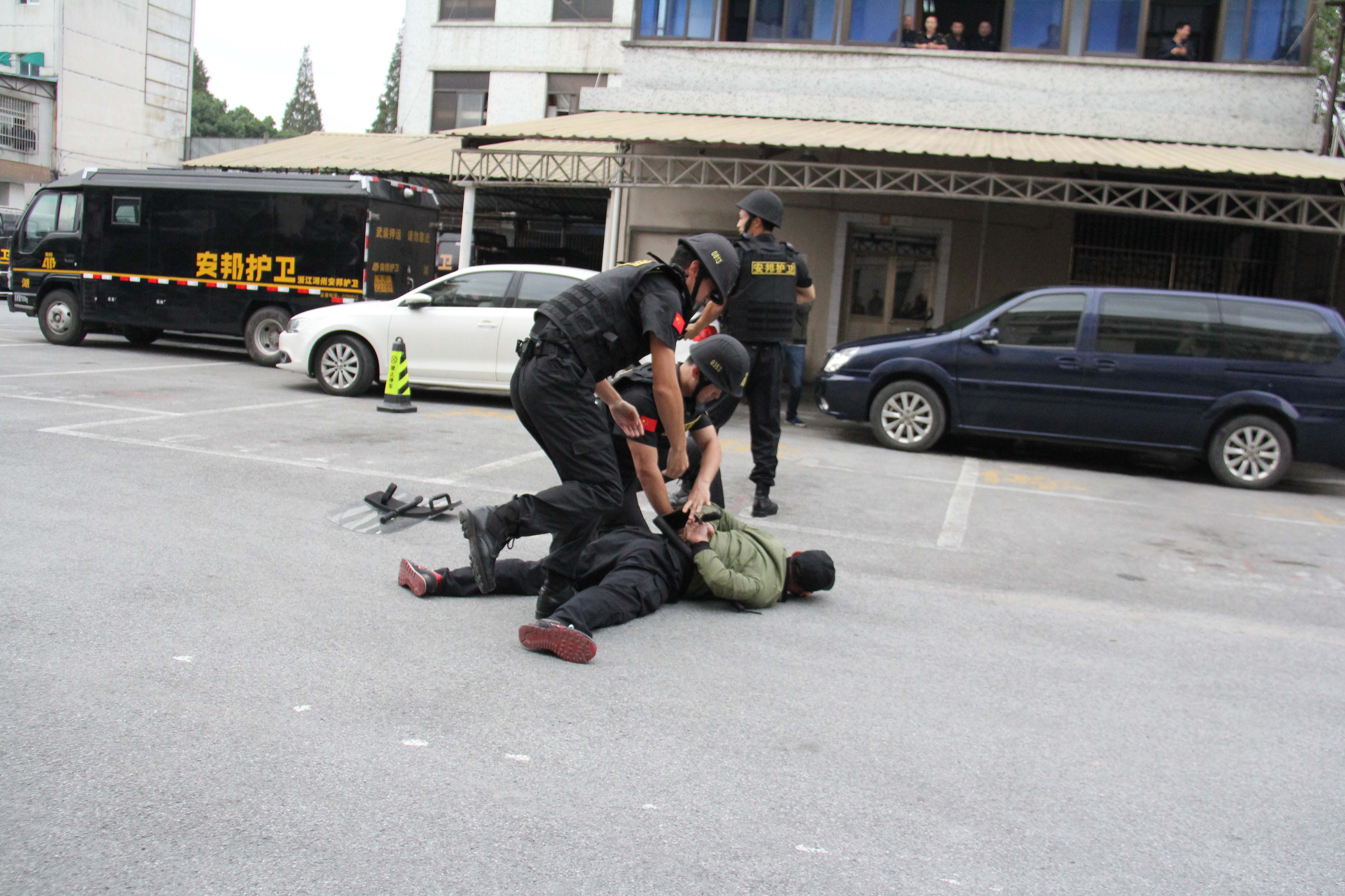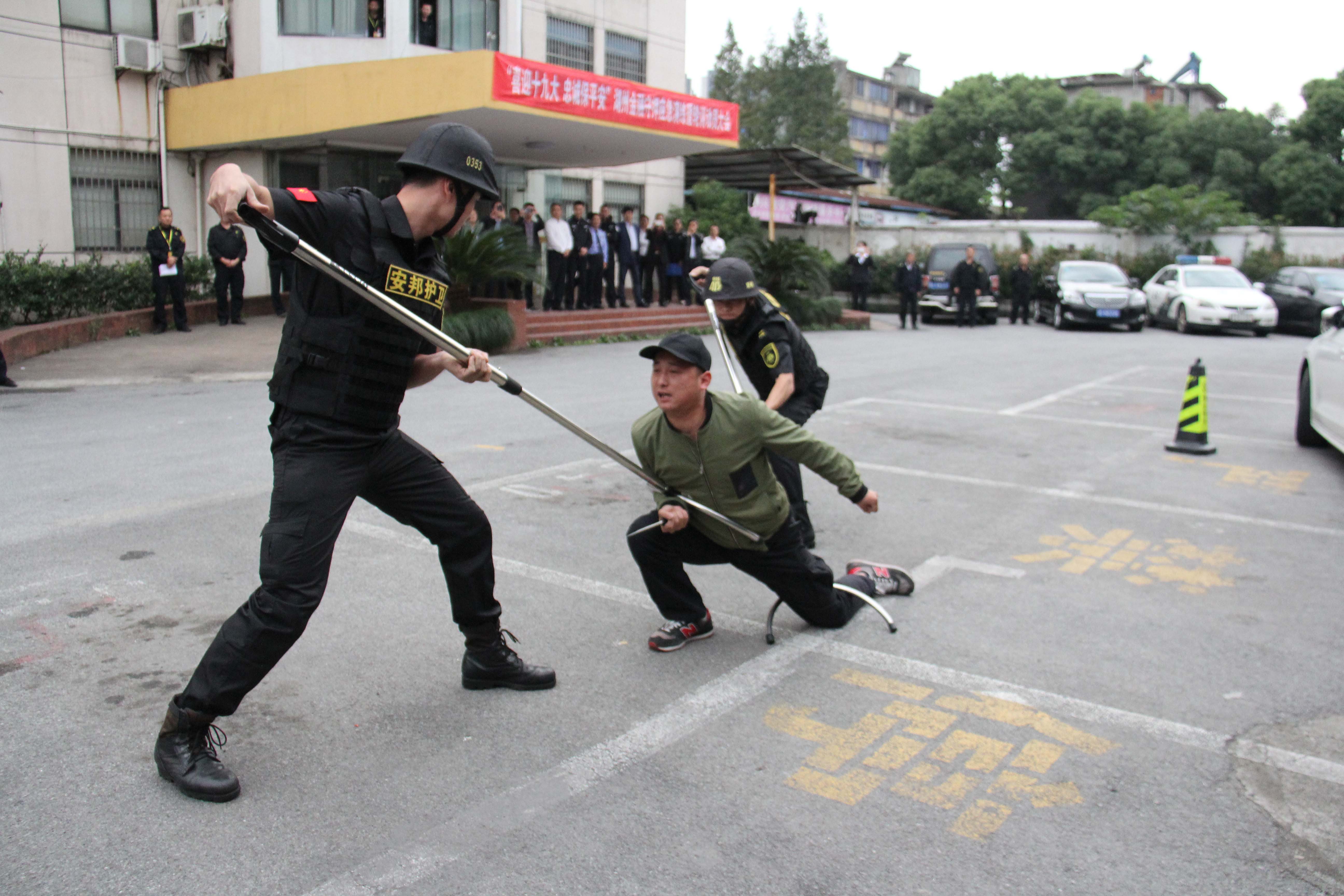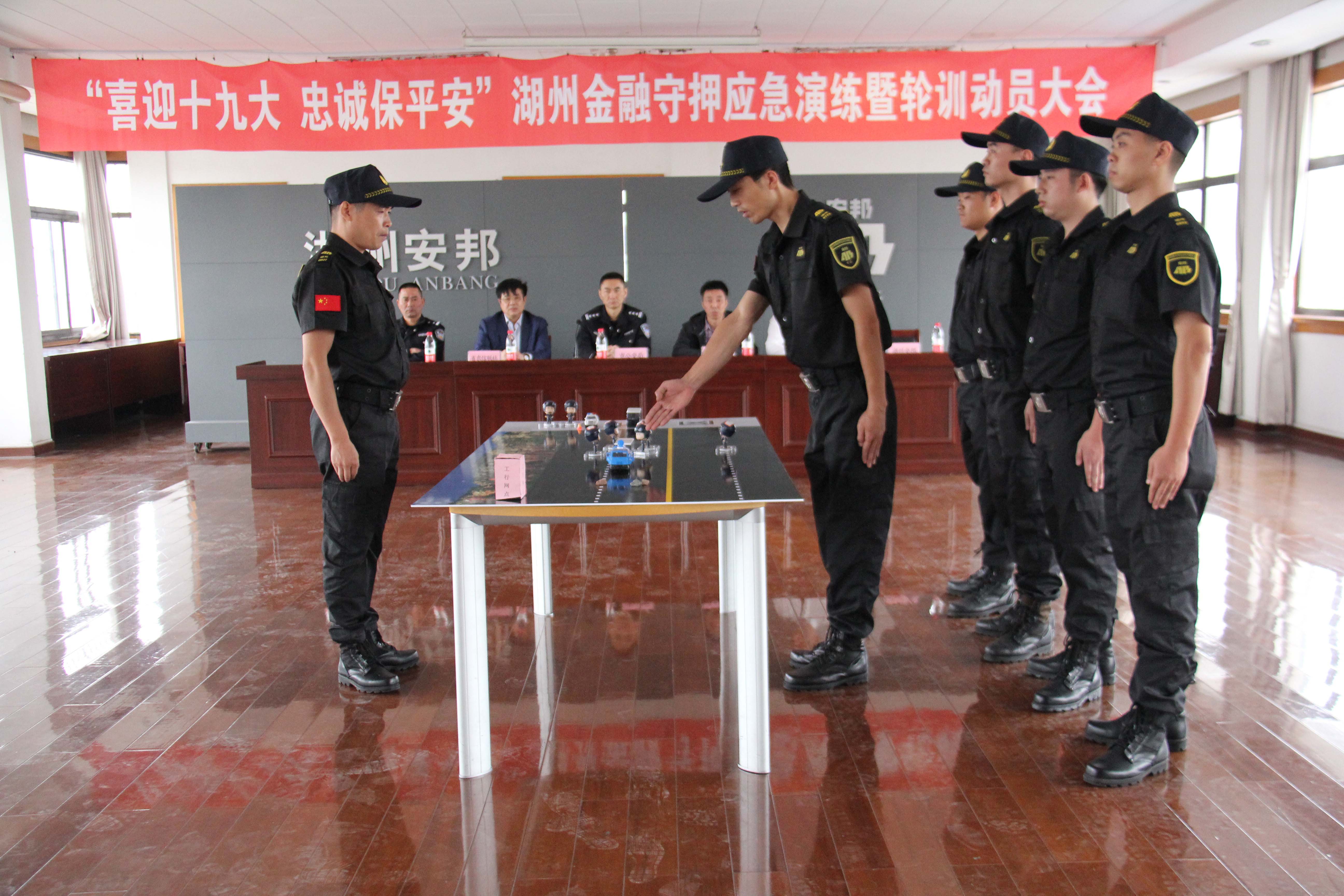 为迎接党的“十九大”胜利召开,10月13日,湖州安邦护卫公司开展“喜迎十九大 忠诚保平安”湖州金融守押应急演练活动。市公安局、吴兴区公安分局、人民银行湖州分行、浙江省农信联社湖州办事处的领导,以及工商、农业、中国银行等8家金融单位代表和公司员工代表参加了本次活动,观摩了演练全过程。