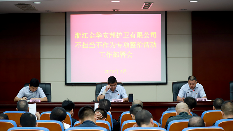 会议传达了市委陈龙书记重要批示和“不担当不作为”专项整治行动动员部署会精神。副总经理张红兵宣读《浙江金华安邦护卫有限公司“不担当不作为”专项整治行动方案》具体部署了专项整治行动的重点、方法步骤和时间节点要求。