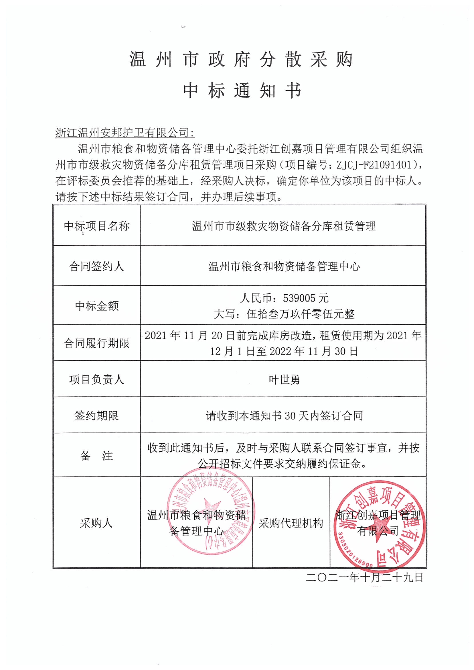 温州安邦护卫公司中标温州市市级救灾物资储备分库租赁管理项目