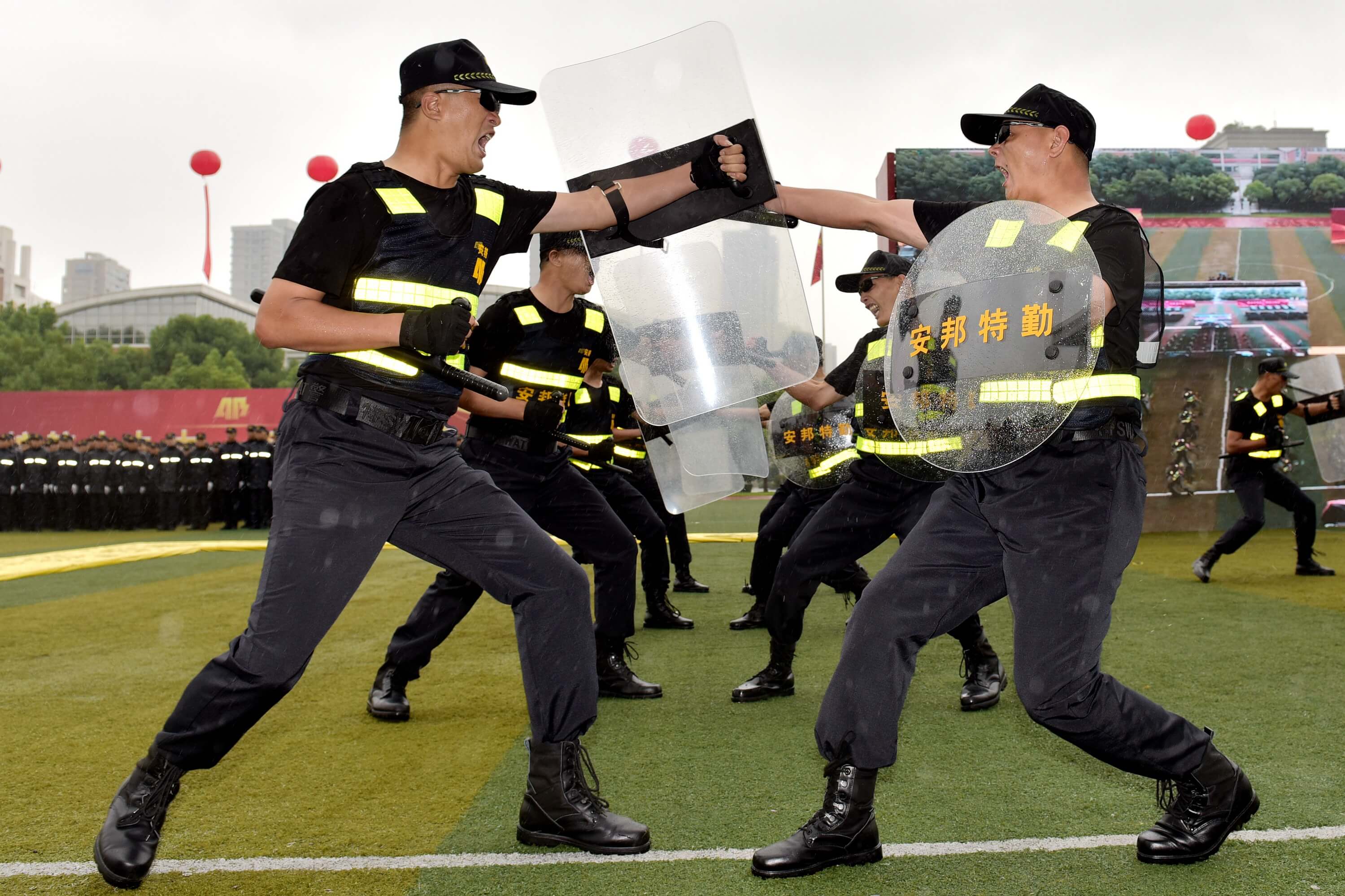 “龙狮呈祥”、擒敌拳表演、警棍盾牌术表演、“武魂”特保武术表演、抢劫处置模拟表演、防暴枪战术动作综合演练等节目异彩纷呈,安邦护卫员工用他们过硬的技能、优良的素质、精彩的表演,展示了“大练兵”成果,展现了浙江国企铁军良好形象。