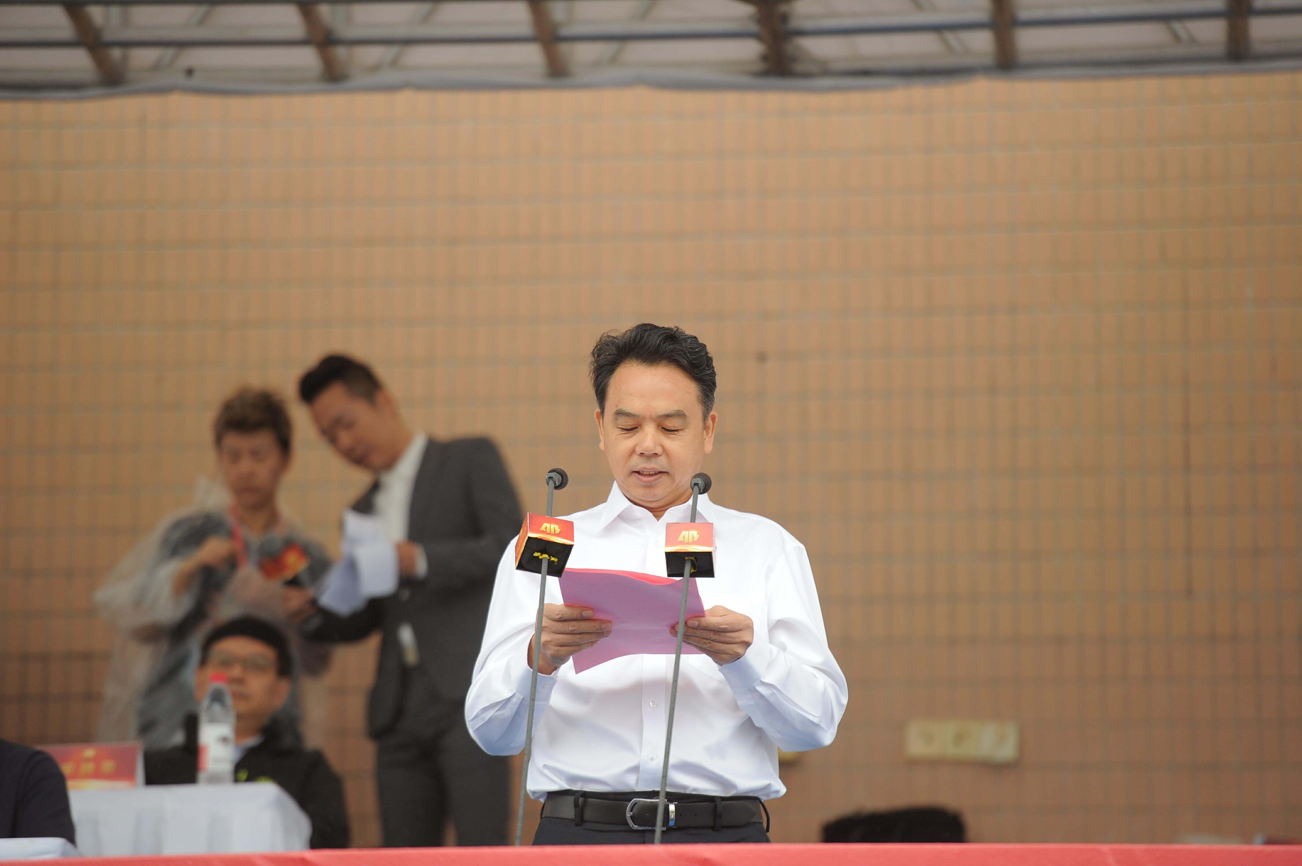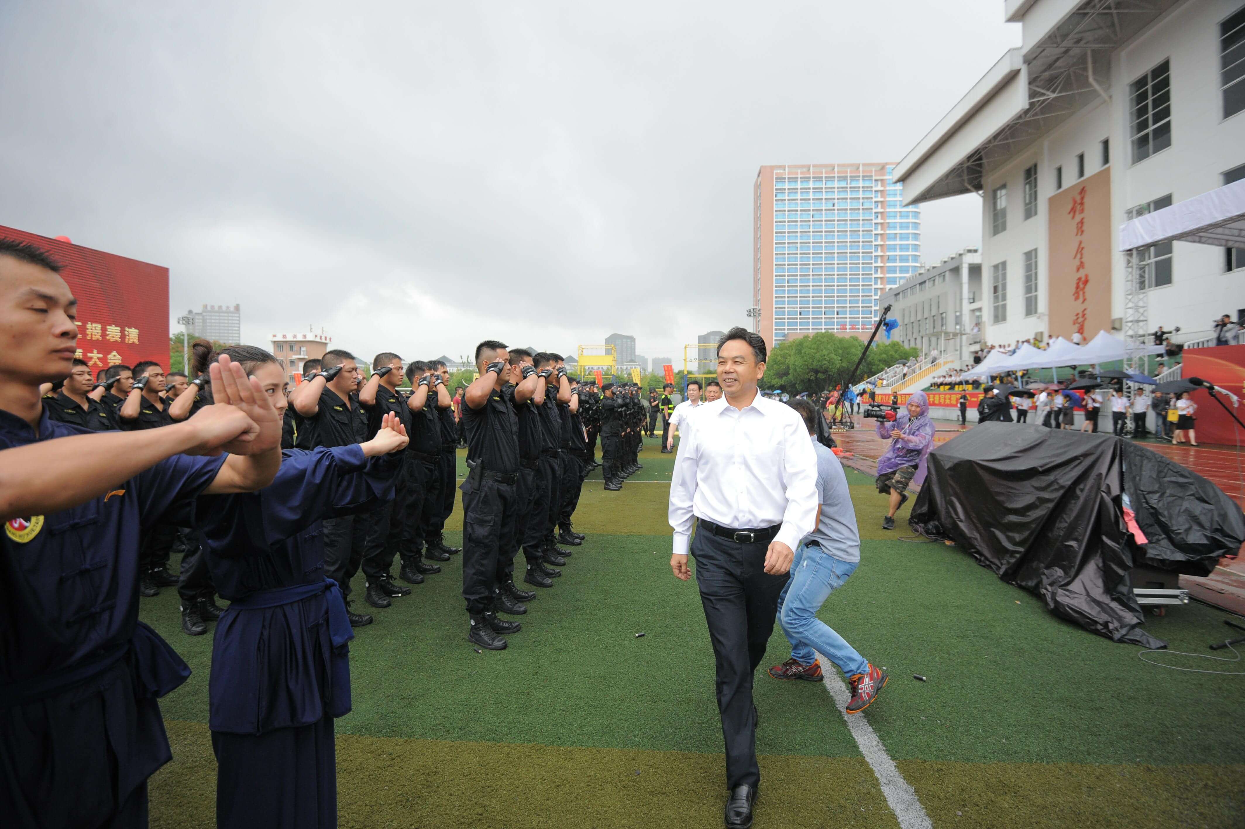 誓师大会在疾风劲雨中举行。现场由麻豆做爱 各子公司共1000余名员工代表、10余辆押运车组成气势雄伟的誓师方阵和装备方队,向来宾展示安邦风采。