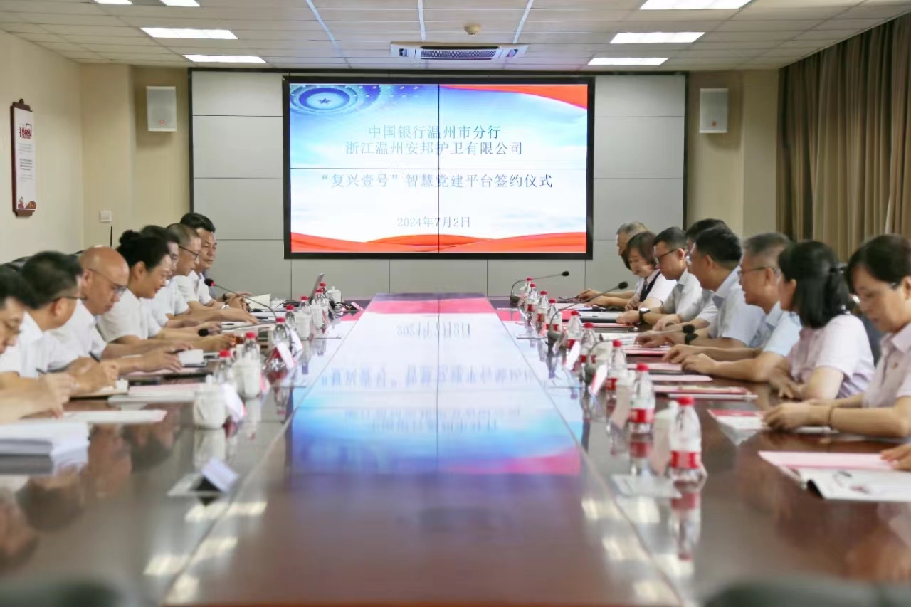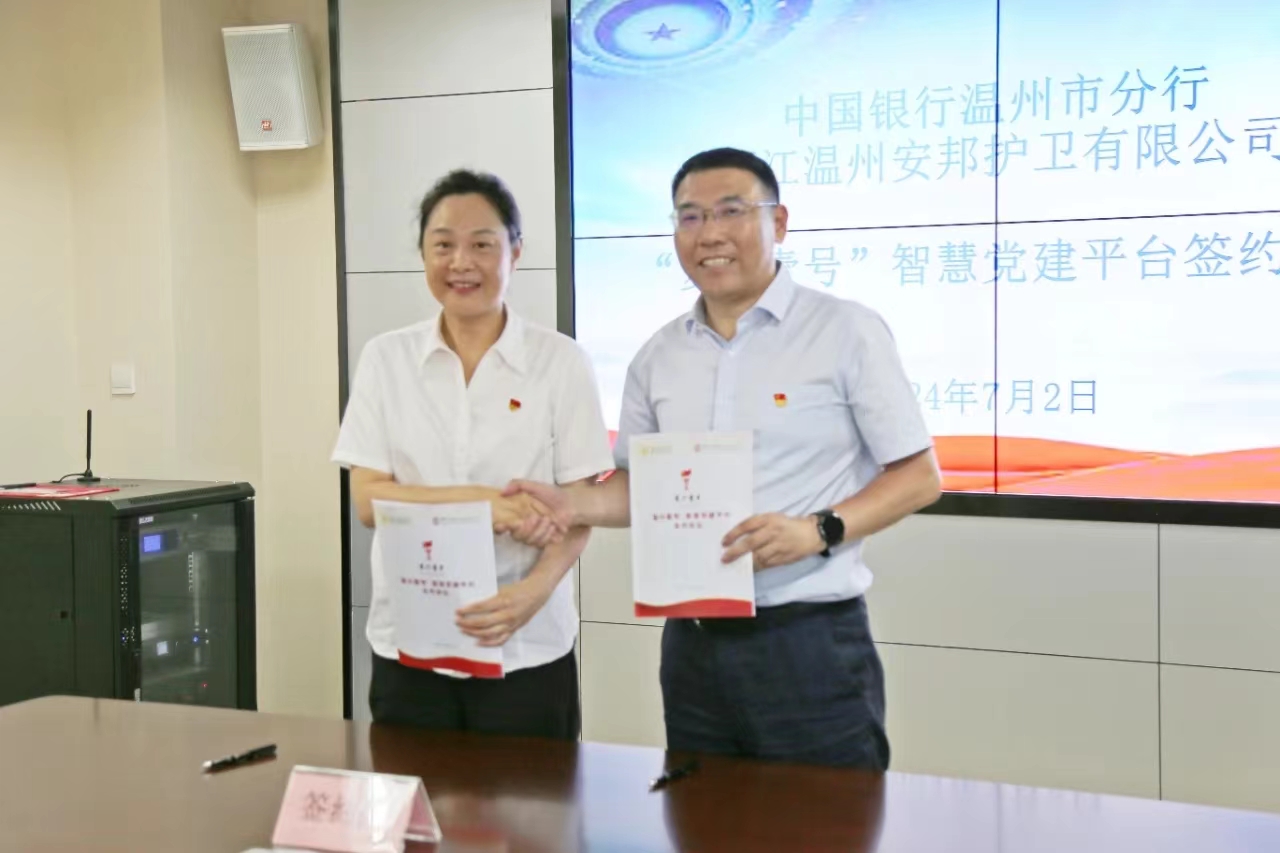 7月2日,浙江温州安邦护卫有限公司与中国银行温州市分举行“复兴壹号”智慧党建平台签约仪式。公司党委书记、董事长方芳,党委副书记、纪委书记余建东,党委委员、副总经理叶世勇及相关部门负责人参加。