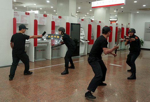 押运员当即举护盾防卫、车长举枪震慑并立即向指挥中心报警,两人与歹徒形成对峙;同时,二名交接员快速转移款箱。银行保安员、大堂经理迅速组织引导疏散客户;银行网点工作人员立即按下紧急报警按钮。