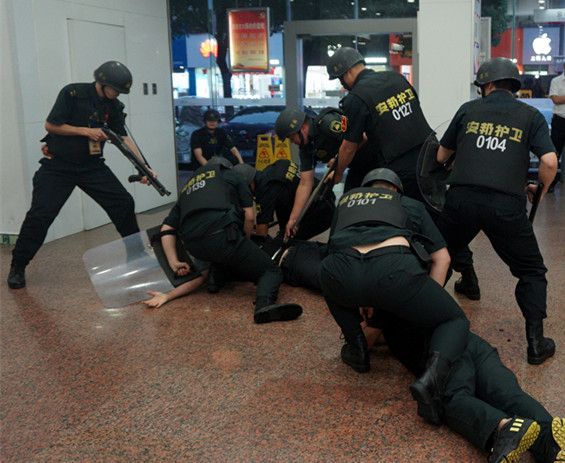 演练地点设置在中国工商银行嘉善支行营业部内,安邦护卫小队模拟在网点执行ATM加钞业务时遇持刀歹徒抢劫的情景进行应急处置。押运员、交接员在网点内按规程进行对接后,两名交接员在二名押运员护卫下,持款箱行往ATM加钞间准备执行任务,此时2名持械(一人持砍刀,一人持菜刀)歹徒突然闯入网点袭击小队,试图抢劫款箱。