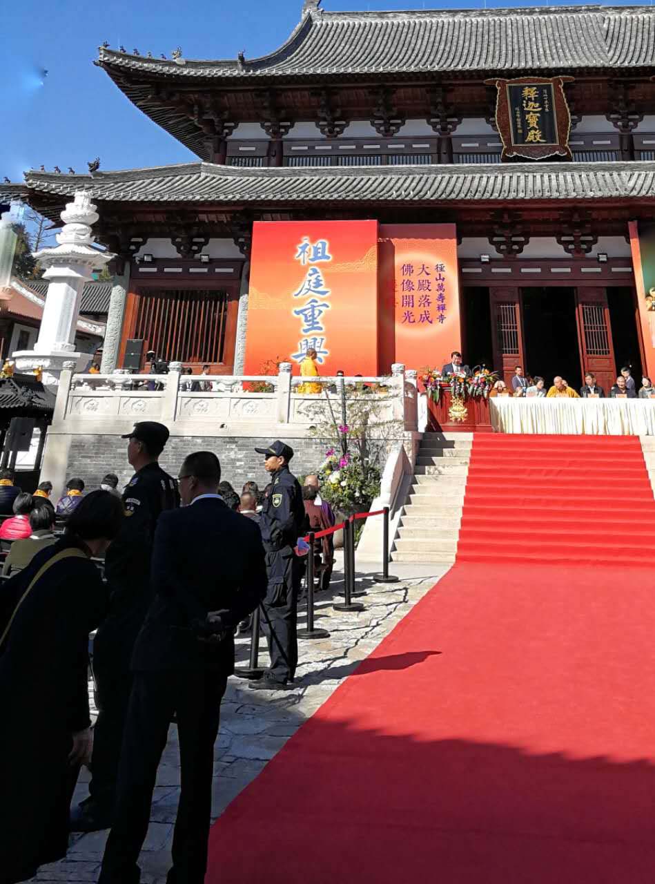 2017年11月9日,杭州径山禅寺举行了大殿落成佛像开光庆典活动。此次开光庆典活动是一场世界级的佛教盛事,有中央统战部、国家宗教局、中国佛教协会、浙江省政府、浙江省佛教协会、杭州市政府、杭州市佛教协会等单位有关领导以及来自各国的百位高德大僧、各界百名学者出席,其整体安保工作任务由麻豆做爱 承担。活动期间,百名安保工作人员在集团公司的坚强领导下,按照整体安保工作部署和要求,以超大的决心、超高的标准、超强的措施、超严的要求、超佳的状态,层层管控,筑牢安全防卫墙,整体安保工作圆满收官。