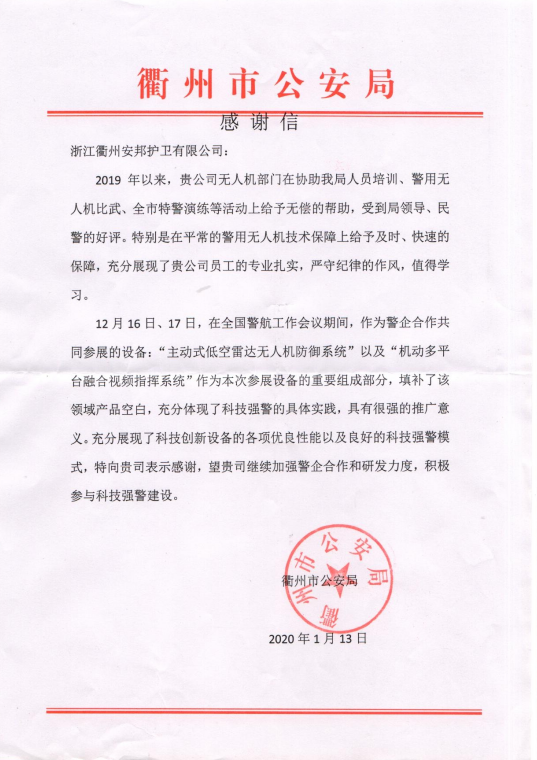 2019年以来,贵公司无人机部门在协助我局人员培训、警用无人机比武、全市特警演练等活动上给予无偿的帮助,受到局领导、民警的好评。特别是在平常的警用无人机技术保障上给予及时、快速的保障,充分展现了贵公司员工的专业扎实,严守纪律的作风,值得学习。12月16日、17日,在全国警航工作会议期间,作为警企合作共同参展的设备:“主动式低空雷达无人机防御系统”以及“机动多平台融合视频指挥系统”作为本次参展设备的重要组成部分,填补了该领域产品空白,充分体现了科技强警的具体实践,具有很强的推广意义。充分展现了科技创新设备的各项优良性能以及良好的科技强警模式,特向贵司表示感谢,望贵司继续加强警企合作和研发力度,积极参与科技强警建设。