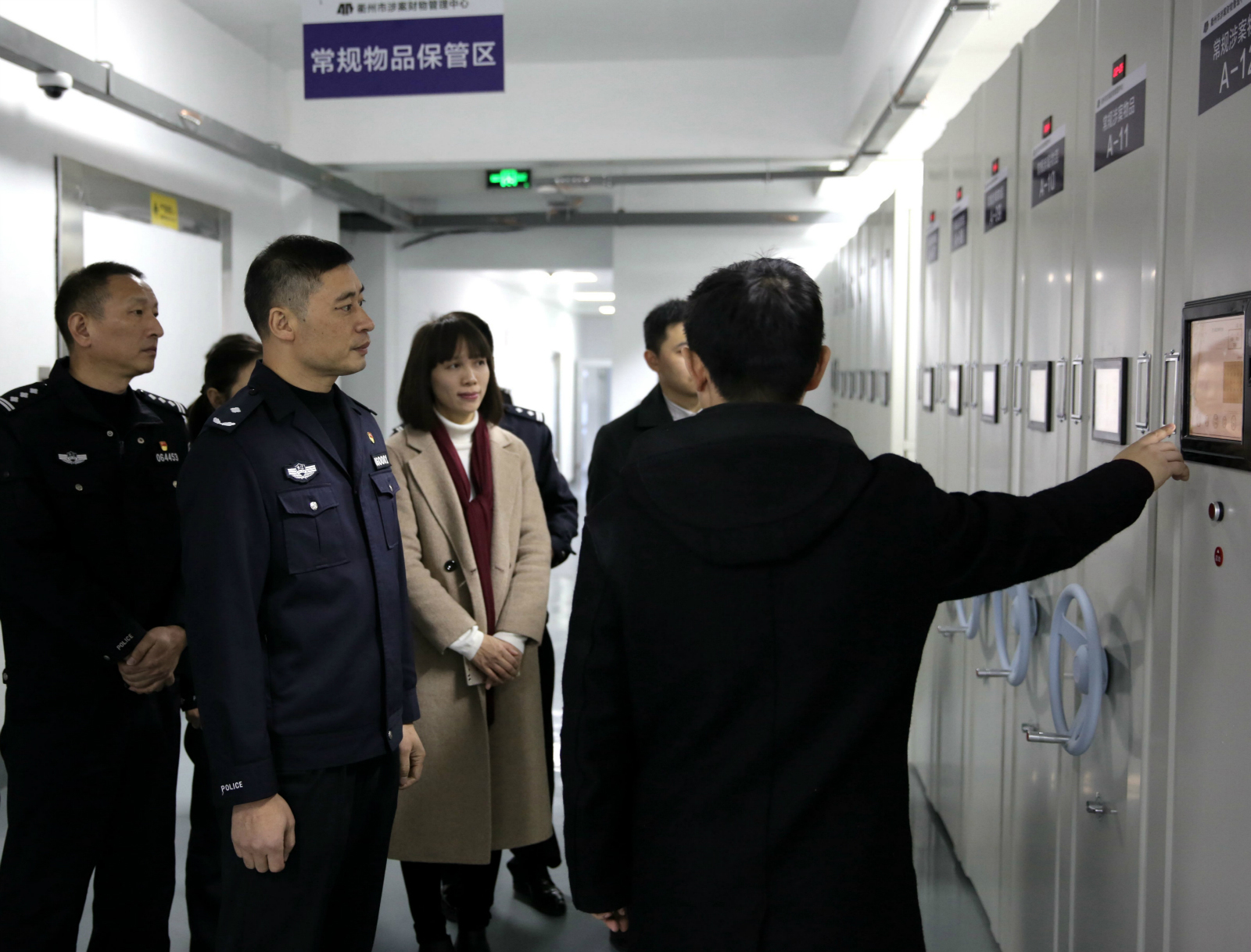 王顺大一行在公司党委书记张淑芬的陪同下,首先视察了由衢州安邦护卫规划建设的衢州市涉案财物管理中心,详细听取了案管中心的建设情况,并围绕信息安全、保管措施、运行机制等重点问题进行了深入细致的了解。王顺大对案管中心集约管理、线上流转的管理模式给予了肯定,提出要将案管中心建设成为规范化、智能化、集约化的现代化管理中心,为基层办案单位、一线民警减压减负,做到“一次也不用跑”。