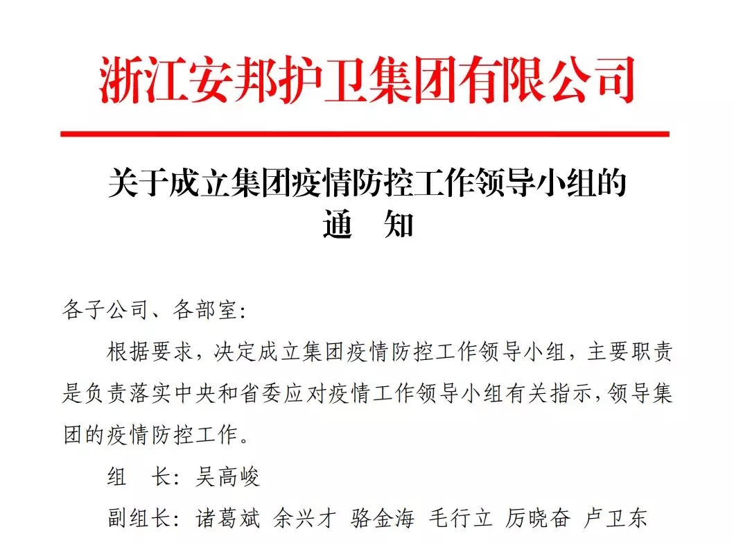 1月27日,集团党委向全体党员干部发出抗击新型冠状病毒感染肺炎疫情倡议书,要求发挥基层党组织战斗堡垒作用和党员的先锋模范作用,做到十个“带头”,团结带领全体安邦护卫员工共同打赢这场疫情防控战役。即:带头把防控疫情作为当前压倒一切的政治任务,上下同欲、敢于亮剑,积极投入全民防控疫情的战争;带头准确把握、全面落实中央、省委、省国资委党委和集团党委关于新型冠状病毒感染的肺炎疫情防控工作的各项决策部署,敢于负责、勇于担当;带头担当值守,心中有党、心中有责,保持通讯方式24小时畅通,守土有责,守土尽责,严禁消极应对;带头宣传党和政府的相关政策,加强正面宣传引导,不信谣、不传谣,避免产生不必要的恐慌情绪;带头配合所属地方疫情防控工作,关心关爱一线押运员,对重点人群、重点区域、重点情况做到早发现、早报告、早处置;带头积极参与疫情防治知识普及,引导职工群众正确理解、积极配合、科学参与疫情防控;带头开展党员志愿服务,主动参与重点人群排查、防控物资准备、舆论信息引导等各项工作,努力冲在前、做示范;带头并带动家人减少外出,不去人流密集场所,在春节期间不去酒店、饭店聚餐和赴宴;带头提高防护意识,外出要戴口罩,勤洗手洗脸,对于使用过的口罩不要随意丢弃,放入垃圾袋封口处理;带头抵制假冒伪劣产品、囤积居奇、哄抬物价、行骗牟利等扰乱公共秩序的行为。