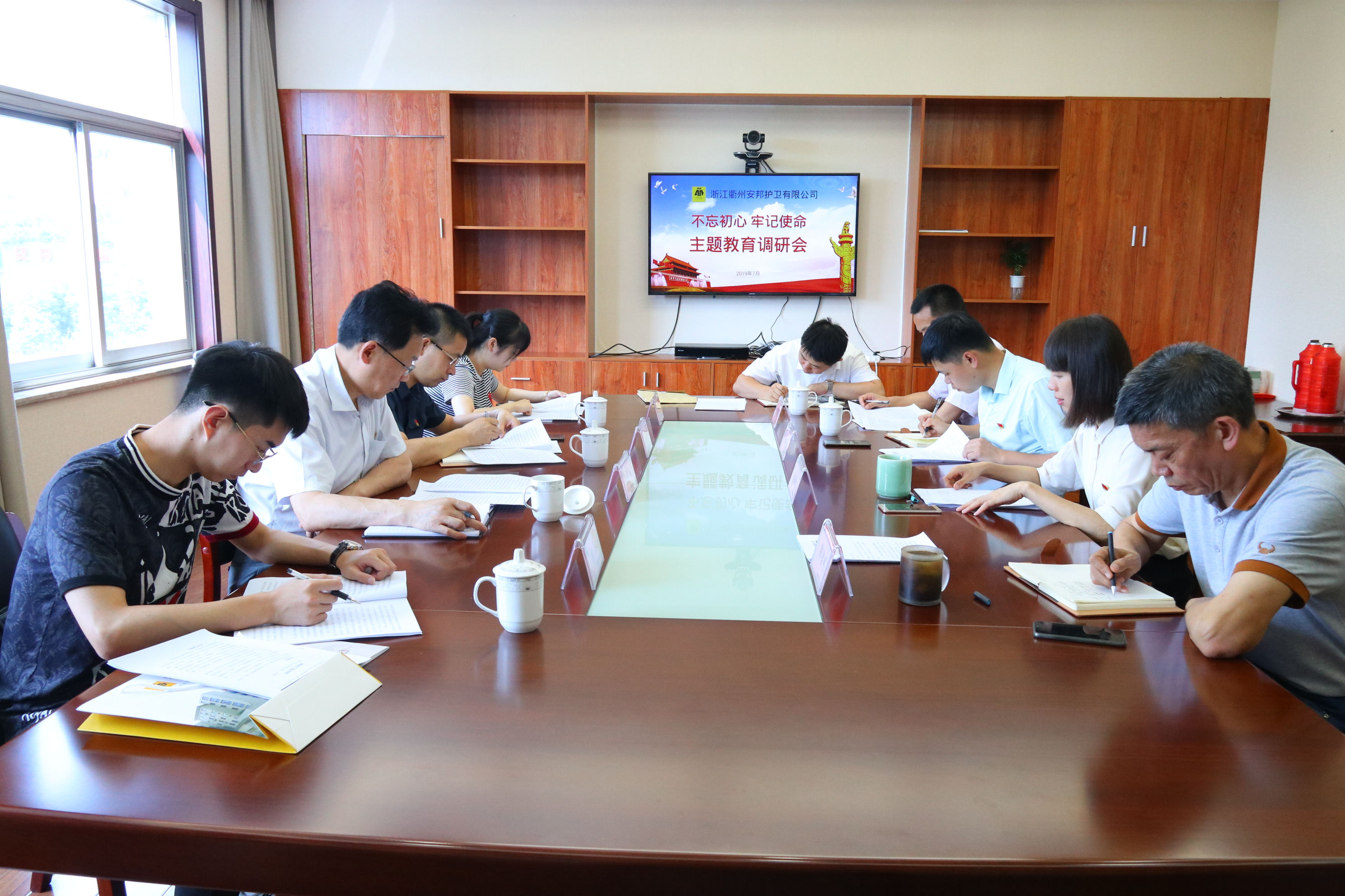 有限公司党委副书记余兴才一行来到浙江衢州安邦护卫有限公司,开展“不忘初心、牢记使命”主题教育调研,衢州公司党委书记、总经理张淑芬,党委副书记、纪委书记郭启明,党委委员、副总经理郑胜,党委委员、总经理助理琚苏炳参加调研会。