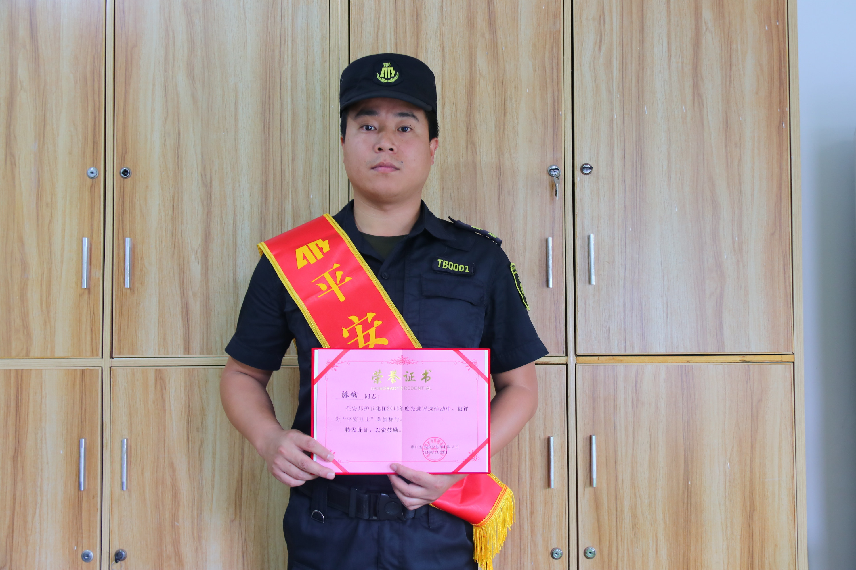 陈斌是第一批加入安邦特保大队的队员,他严谨自律,在执勤纪律和考核制度上零扣分,连续两年以全优的成绩被评为公司“优秀员工”。2018年获集团公司“平安卫士”荣誉称号。