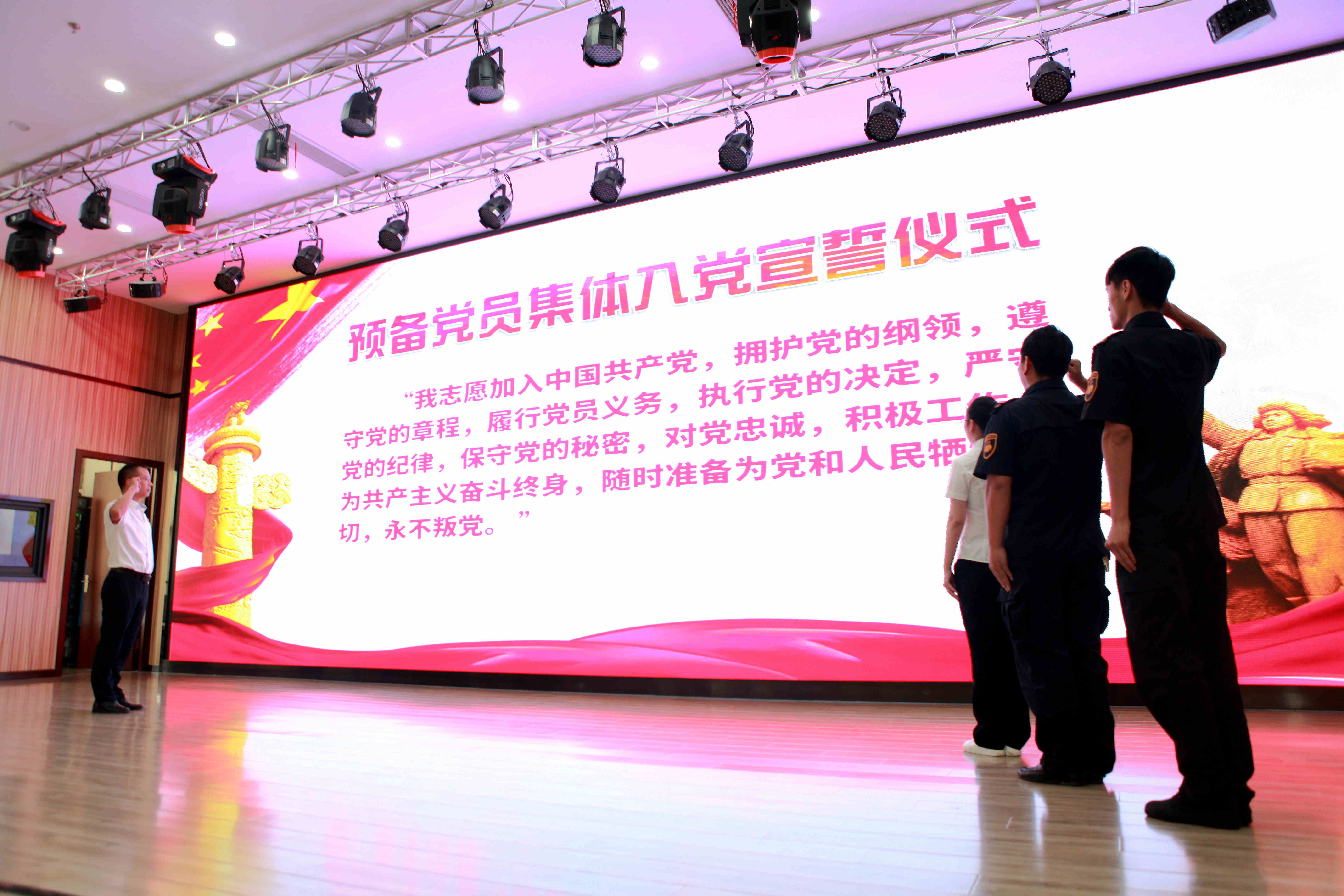 党员大会上,在领誓人的带领下,台州公司三名预备党员面对党旗庄严宣誓。全体党员也重温入党誓词。