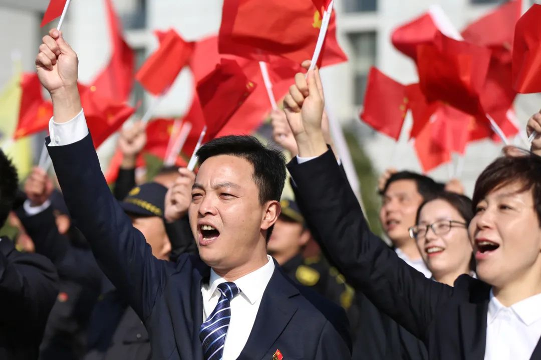 在雄壮的国歌声中,五星红旗冉冉升起。全体方阵人员精神抖擞、齐唱国歌、声音洪亮。站在“红色根脉”的源头坐标上,作为“守护红船”志愿者,每个队员再次深刻感悟红船畔金融卫士的初心使命和责任担当。