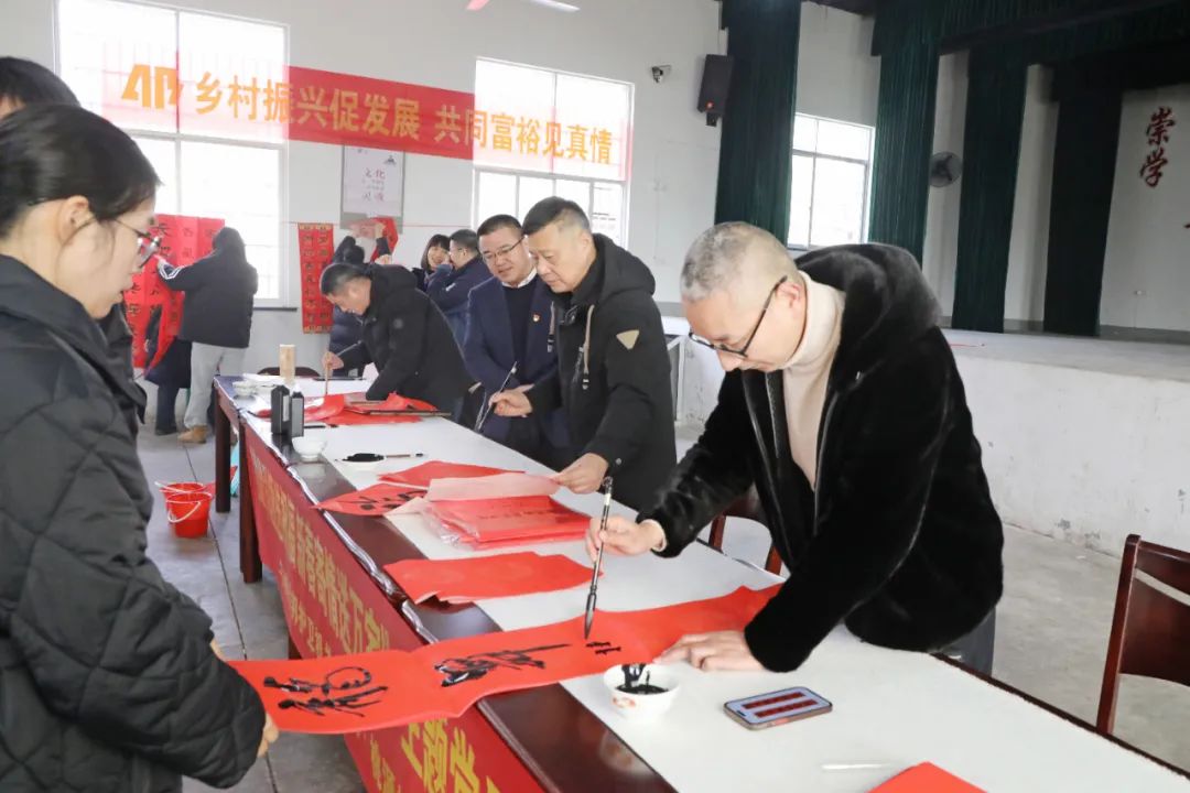 本次活动特邀3位书画嘉宾现场挥毫泼墨,书写福字和对联。嘉宾们笔走龙蛇,将美好的祝福融入到一幅幅作品中。村民们有序地排队领取,脸上洋溢着幸福的笑容。这些饱含墨香的福字和对联,不仅为村民们增添了节日的喜庆氛围,更传递了对美好生活的礼赞期许。