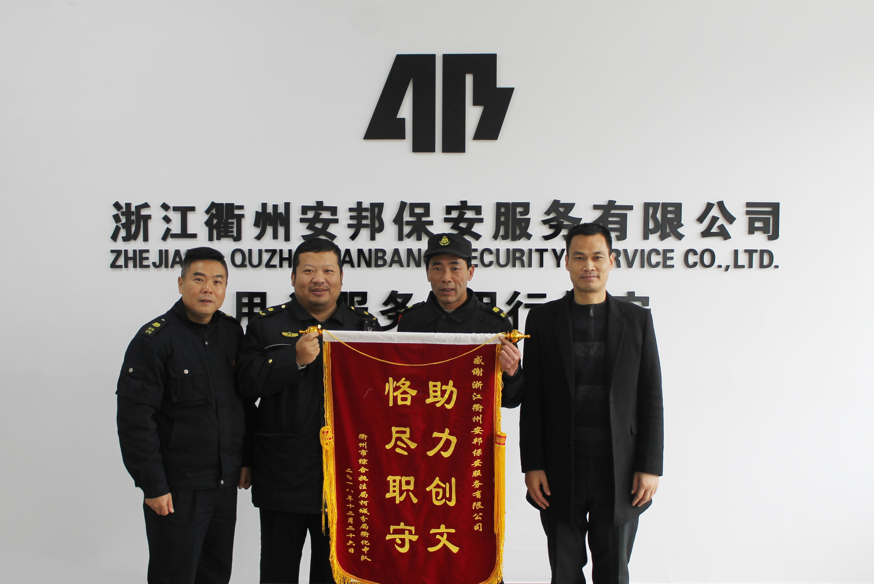 12月26日上午,衢州市综合执法局柯城分局衢化中队中队长余军将一面写着“助力创文 恪尽职守”的锦旗送到浙江衢州安邦护卫有限公司党委委员、总经理助理琚苏炳及安邦保安公司总经理鲁家富的手中。