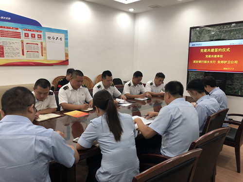 为充分发挥党组织凝聚力和战斗力,着力构建基层党建工作新格局,促进双方共同发展,7月24日,直属守押大队党支部与浦发银行丽水支行机关党支部举行党建共建签约仪式。浦发银行丽水支行副行长林建勇、机关党支部书记李飞,公司党委委员、工会主席郑洋,直属大队党支部书记、大队长张俊陶党委书记、党群工作部负责人等双方代表出席活动。