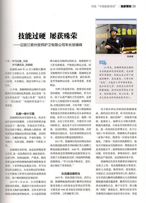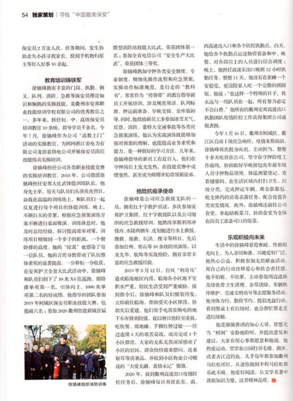 队伍建设展担当。2019年,因业务能力突出,责任心强,徐镇峰被选调至浙江衢州安邦保安服务有限公司任保安运管部运营管理,主要负责1000余名保安员的队伍建设、日常管理、工作调配等工作。
